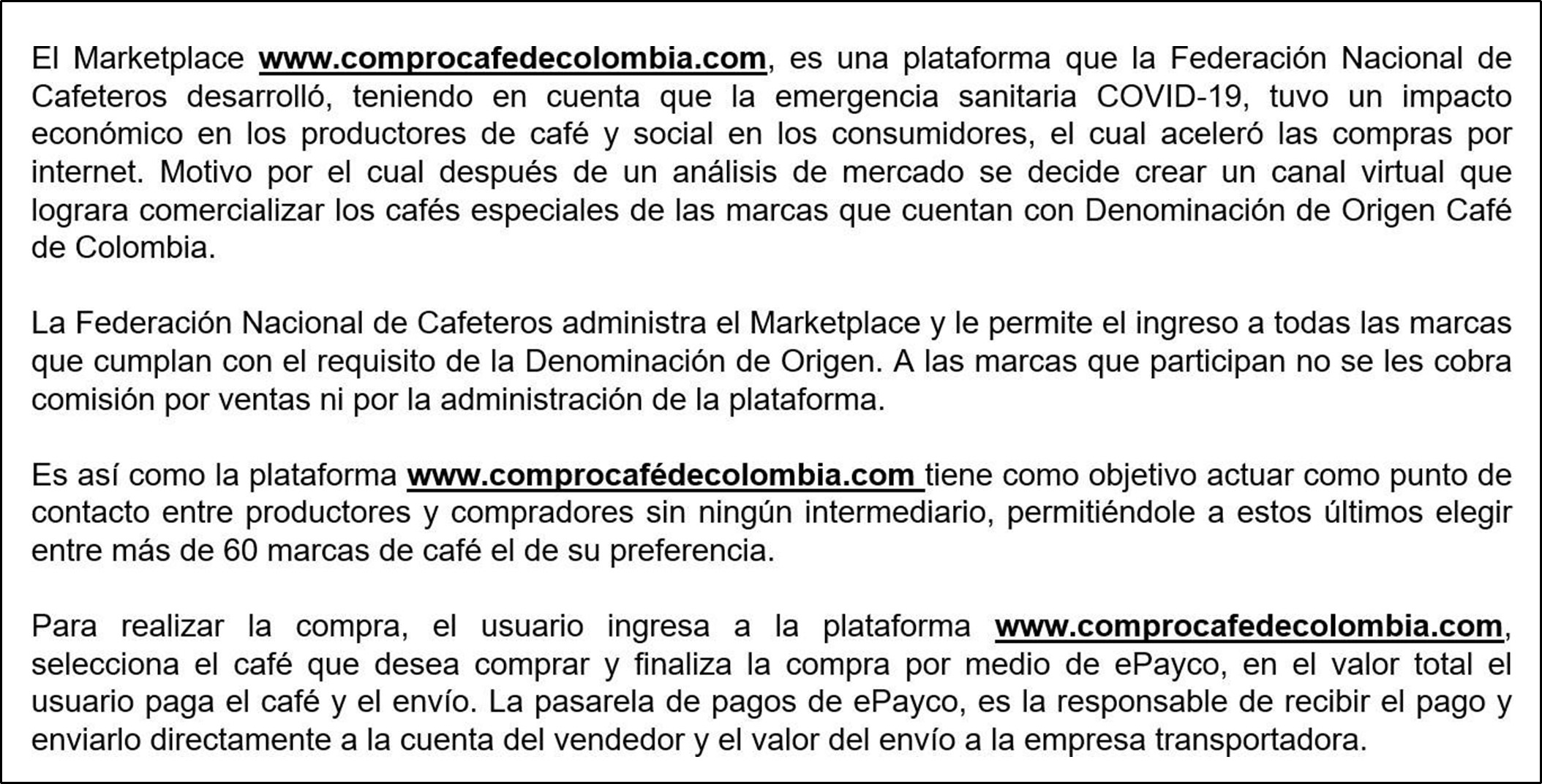 - Sin comisiones ni cobros adicionales: La Federación Nacional de Cafeteros no cobra comisión sobre las ventas, tampoco cobra el almacenamiento del café y alistamiento de los pedidos.