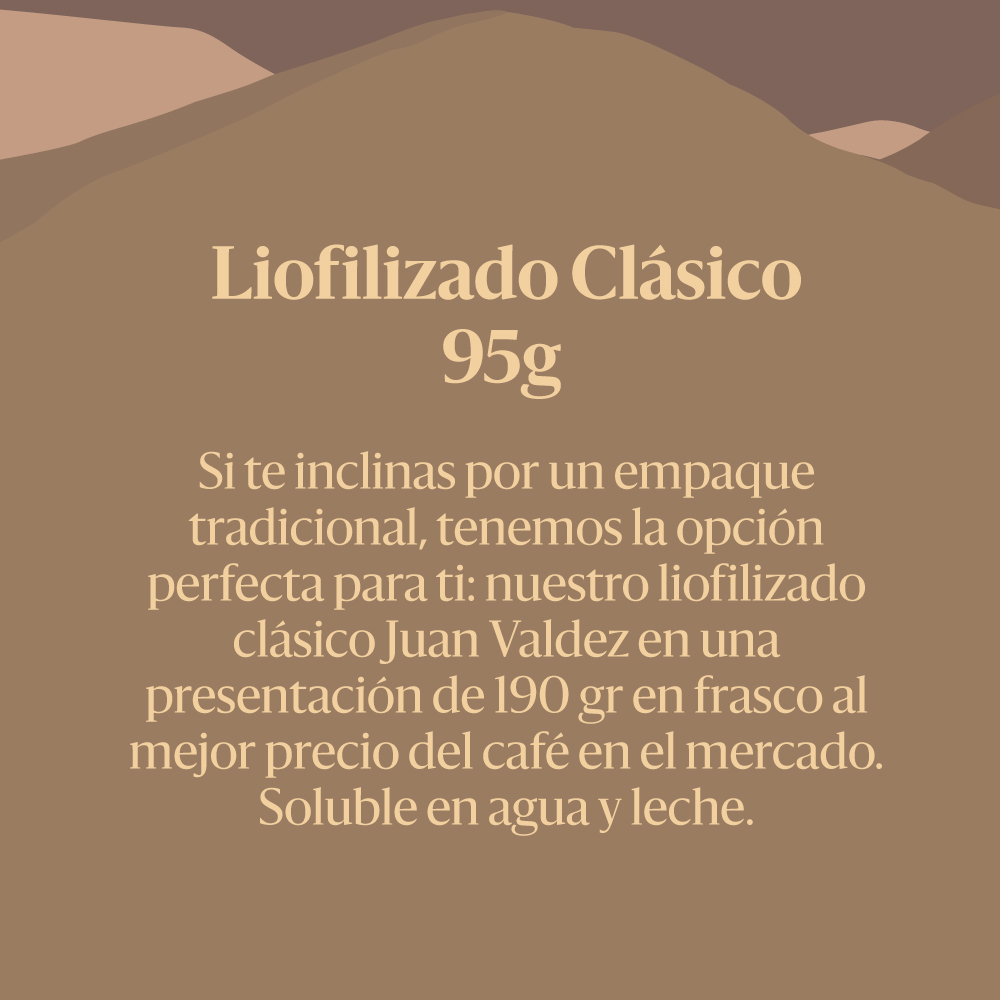 Si te inclinas por un empaque tradicional, tenemos la opción perfecta para ti: nuestro liofilizado clásico Juan Valdez en una presentación de 95 gr en frasco al mejor precio del café liofilizado en el mercado. Soluble en agua y leche.
