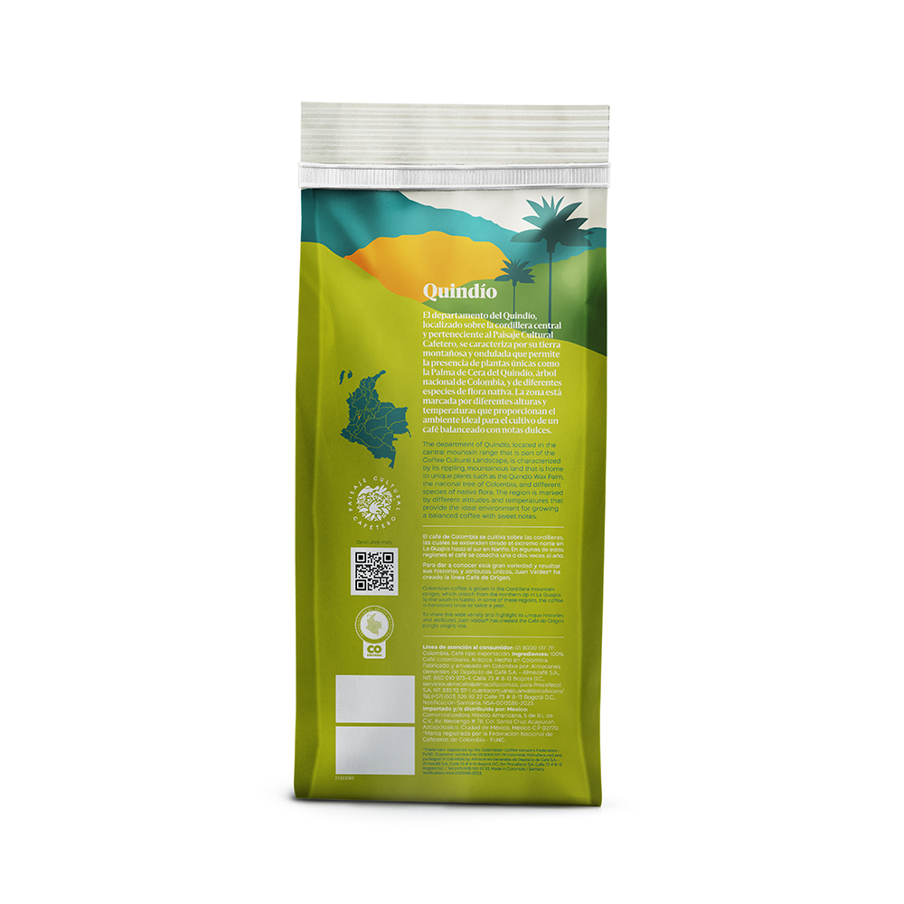 El departamento de Quindío está localizado sobre la cordillera central y pertenece al Paisaje Cultural Cafetero, se caracteriza por su tierra montañosa y ondulada que permite la presencia de plantas como la Palma de Cera del Quindío, árbol nacional de Colombia y de diferentes especies de flora nativa. La zona está marcada por diferentes alturas y temperaturas que proporcionan el ambiente ideal para el cultivo de un café de origen balanceado, con notas de sabor chocolate blanco, caramelo y nuez tostada, acidez media baja y cuerpo medio.