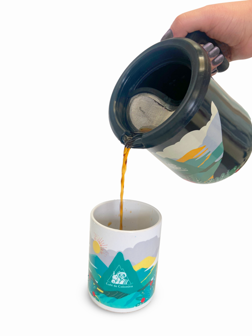 Vive la tradición colombiana con esta olleta de peltre esmaltado, amigable con el medio ambiente y con un filtro especial para que preparar tu café sea un experiencia práctica y única cada día.